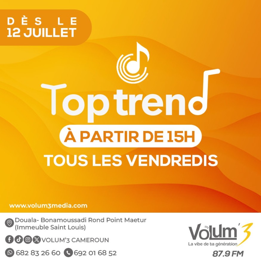 3 mois après le lancement officiel de sa nouvelle grille de programmes, Volum’3 poursuit sa conquête sur les ondes. La Vibe de ta génération amorce une nouvelle étape de son déploiement avec une nouvelle émission qui fera plaisir aux amoureux de la musique : Top Trend. Top Trend est un programme hebdomadaire qui propose aux auditeurs de la Vibe, un top 30 des chansons de la semaine les plus demandées par les auditeurs de VolumHit, l’émission musicale qui a conquit la capitale économique, le Cameroun et le monde via le streaming. Ces chansons sont réparties en 3 catégories : le Top 10 Camer, le Top 10 Afro et le Top 10 Europe et US.Top Trend , c’est le nouveau RDV de vendredi sur Volum’3. Pendant 1H30, vous pourrez bouger au rythme des hits du moment qui font partis de votre quotidien.Cette nouvelle émission qui vous plonge dans un univers où la musique a tous les droits sera drivée par la magnifique et talentueuse Orphée qui fait déjà le bonheur des mélomanes de toutes les générations qui mettent le volume à 3 de lundi à jeudi entre 14H et 17H dans VolumHit.Orphée vous donne RDV pour la première de Top Trend le 12 juillet dès 15H.